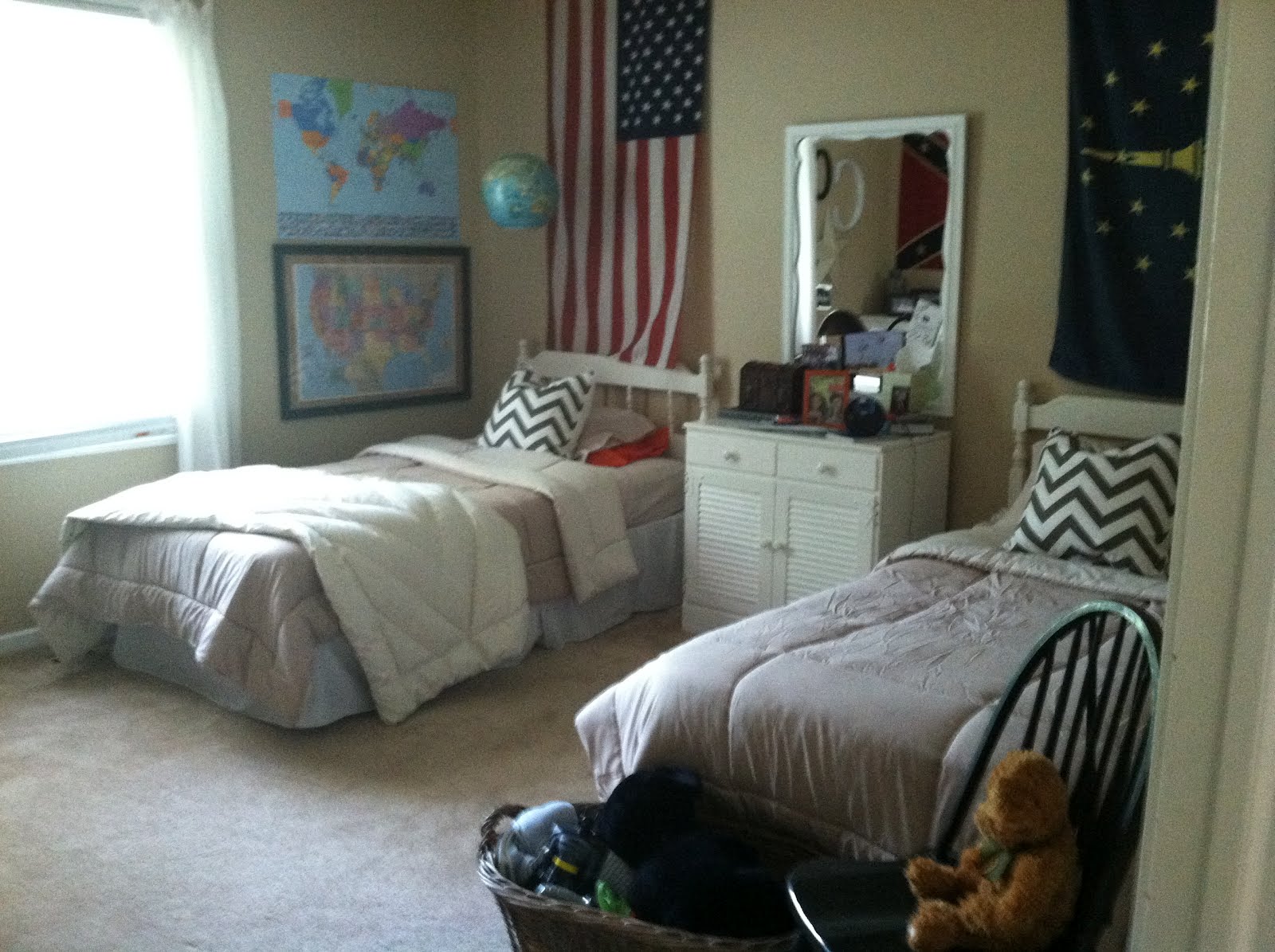 Campbell was lucky enough (along with my oldest Nephew, Jackson)to spend a week in Washington DC with Bryan's Mom and Dad - "Nana and Poppy". They went all out on this trip...no ground left uncovered, they did and saw it all. My FIL spent months plannng this trip sending the boys weekly "learning" assignemnts, historical info, all kinds of US History, etc...the trip is most definately a post all its own but we as a family were so happy to finally have Campbell back home. After DC he went back to NC to spend two more weeks of fun with family. Charlotte and Christian really missed him! SO, while he was away we decided to play...with his room! We surprised him with new bedding and a few fun accessories. He has had the same bedding since he was 2 and it is STILL in awesome shape and super cute but understandably was ready for a change! He also wanted to have some orange in his room....hmmm....how could I incorporate that but not go overboard? Especially since there is so much navy and red in the room already! PILLOWCASES! That was a fun compromise! We went pretty basic and traditional knowing we could change up accessories and colors as he grew some more. He loved the "spruce up" and it was fun to surprise him with it!